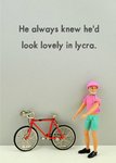 Front of card: 'Look lovely in lycra' Birthday Card Funny photograph of a male doll in lycra with a push bike. Text reads: "He always knew he'd look lovely in lycra.".