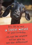 Front of Card: Photograph of goat at top of card with hand lettered typography at the bottom on a red background. Card reads: "It's ok to act a little weird on your birthday... ...it's not like anyone will be able to tell the difference!"