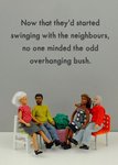 Front of card: Funny photograph of 2 male and 2 female dolls sat on chairs outsde near a potted bush Text reads: "Now that they'd started swinging with the neighbours, no one minded the odd overhanging bush." Back of card: Bold and Bright logo. Moonpig logo