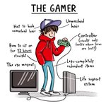 Humour quotes pointing towards cartoon drawing of a gamer.