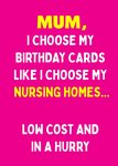 "Mum, I Choose My Birthday Cards Like I Choose My Nursing Homes...Low Cost And In A Hurry". Mum can be personalised!