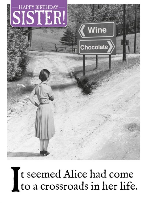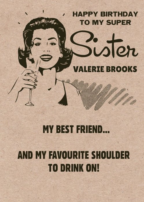 Front of card: Illustration of a woman holding a wine glass with black typography on brown background Text reads: "HAPPY BIRTHDAY TO MY SUPER Sister VALERIE BROOKS. MY BEST FRIEND... AND MY FAVOURITE SHOULDER TO DRINK ON!" With editable text.