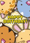 A vibrant and fun Birthday card featuring four cute, Kawaii style cartoon characters; a giraffe, a bird, a cat and a rabbit, there is a yellow zigzag background behind them. The characters have different fur colours and patterns, such as brown, beige, blue-grey, and cream. They also have large pink ears and big eyes that make them look adorable. The card has a bold text in the middle, in capital letters using a fun, playful font. The card is colourful and playful, and it conveys a cheerful and festive mood.