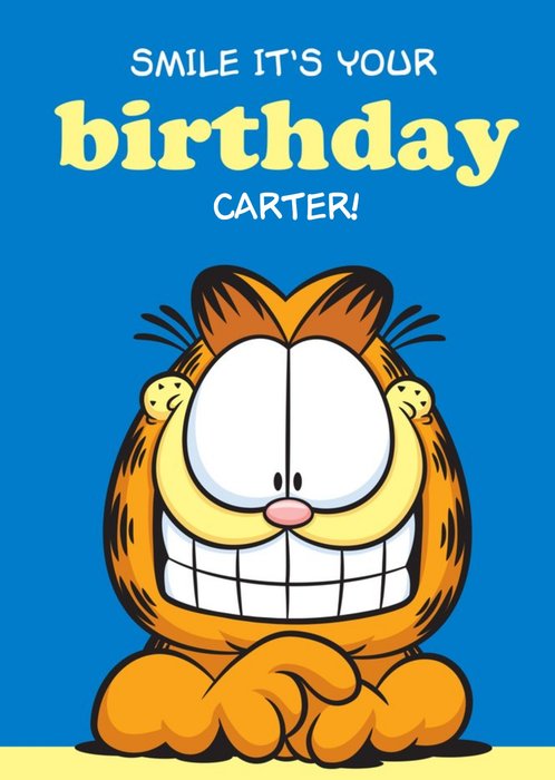 Front of card: Garfield Smile It's Your Birthday Card Features illustration of Garfiled with huge grin on his face. Text reads: "Smile It's Your Birthday Carter!" Carter is customisable.