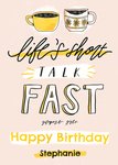 "Life's short, talk fast. Gilmore Girls. Happy birthday Stephanie." The name can be personalised!