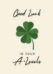 A stylish and calming GCSE good luck card featuring green striped four-leaf clovers and pink flowers on a cream and mint striped background. The message is presented in elegant, mixed fonts for a soft and encouraging feel.