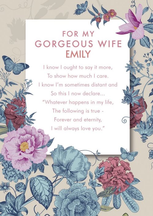 "For My Gorgeous Wife"- fixed "know I ought to say it more, To show how much I care. I know I'm sometimes distant and So this I now declare ... "Whatever happens in my life, The following is true -Forever and eternity, I will always love you."