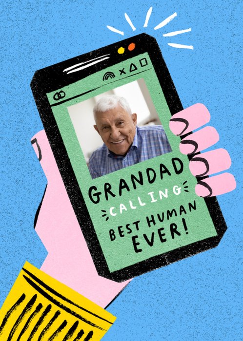 A colourful and quirky greeting card showing a hand holding a cartoon-style smartphone, with a photo area on the screen and the words “Grandad calling – best human ever!” displayed like an incoming video call.