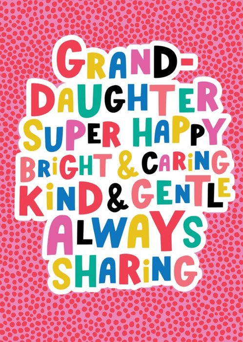 Featuring bold multicoloured typography outlined in white on a pink polka dot patterned background.