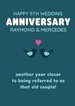 Front of card: Graphic illustration of two dark teal birds facing each other with a pink heart above. Humorous anniversary message above and below in white and aqua text all on a dark teal background. Happy 5th wedding and names are editable. Text reads:"Happy 5th wedding anniversary Raymond and Mercedes. Another year closer to being referred to as that old couple!" With customisable names and Happy 5th wedding.