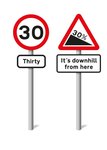 Front of card: It's Downhill From Here! 30th Funny Pun Birthday Card Graphic illustration of road signs. Text reads: "Thirty, It's downhill from here".