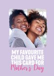 Front of card: Funny Mother's Day Photo Upload Card Grunge style photo frame on a purple background. Text reads: "My favourite child gave me this card for Mother's Day".