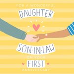 Front of card: Hand In Hand! First Anniversary Card Illustration of holding hands interracial couple. Text reads: "For a wonderful daughter son in law on your first anniversary"