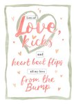 Front of card: Valentine's Day Photo Upload Card Hand painted typography with hearts and a border. Text reads: "Lots of love, kicks and heart beat flips all my love from the bump".