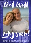 Front of card: Get Well Soon Photo Upload Card Handwritten typography on a blue patterned background. Text reads: "Get well very soon! Sending all my love Steven". 'Sending all my love Steven' can be personalised!
