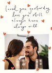 Front of card: Valentine's Day Photo Upload Card Handwritten typography with a photo frame surrounded by hearts. Text reads: "Loved you yesterday love you still always have always will".