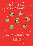 Front of card: Featuring a funny festive illustration of pea characters. Text reads: "Hap-pea Christmas! Have a great time Frankie". 'Frankie' can be personalised!