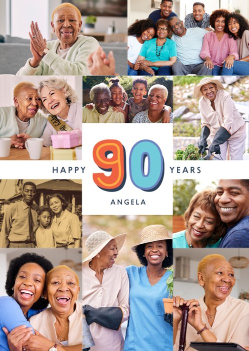 A modern, sentimental design featuring a centralised 90th Birthday message with an editable name, on a white background surrounded by ten photo upload frames.