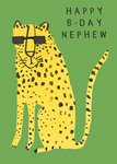 Featuring an illustration of a yellow leopard wearing glasses. The leopard is covered in black spots, and the background is a vibrant lime green. Overall, it’s a colourful and festive design!