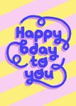 A bold typographic birthday card design with playful hand-drawn style text in bright purple. The background features diagonal pastel pink and yellow stripes.