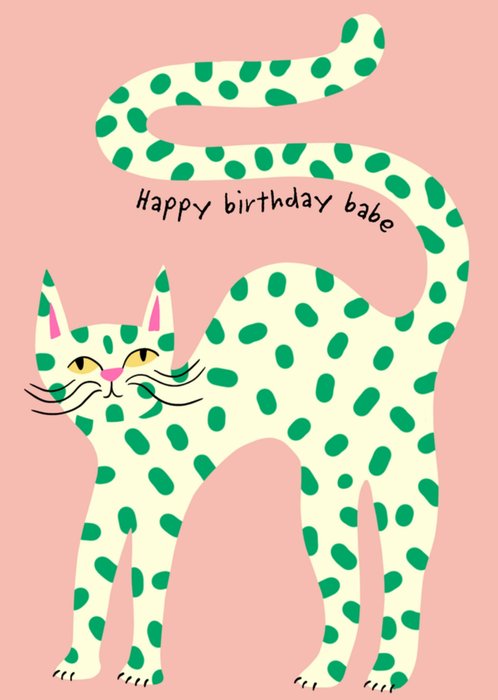 Featuring a cream coloured cat with green spots and a long tail on a light pink coloured background.