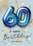 Featuring large blue foil number balloons and an editable message surrounded by confetti dots and gold foil details on a pale blue background.