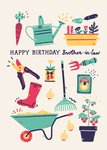 A vibrant birthday card adorned with gardening-themed illustrations. These include a carrot, watering can, flower pot with blossoms, garden fork, pruning shears, red boot, wrapped gift, rake, seed packet, and a wheelbarrow with bulbs at its base. In the centre, there is handwritten style typography. This all creates a cheerful and engaging greeting for someone with an interest in gardening. .