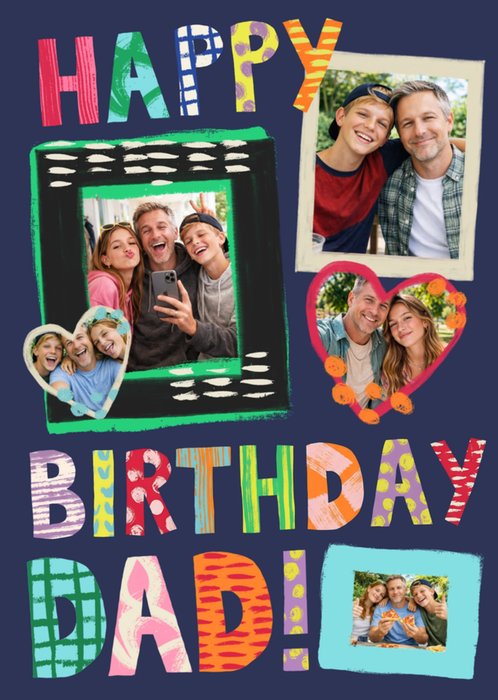 Featuring colourful, patterned block letters and multiple photo upload sections, including square and heart-shaped frames arranged on a dark blue background, this greeting card is designed for a personalised birthday celebration.