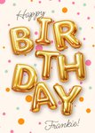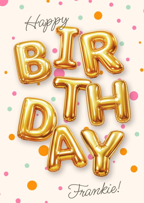 Featuring gold balloon letters and scattered confetti dots on a cream coloured background.