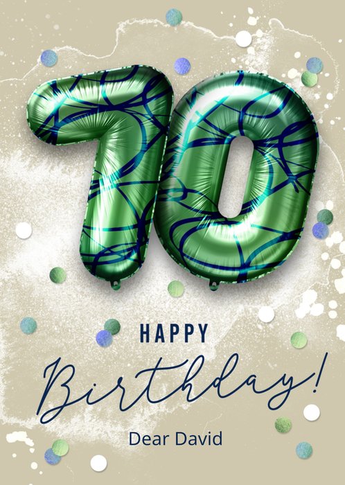 Featuring large green, patterned foil number balloons and an editable message surrounded by confetti dots and foil details on a beige background.
