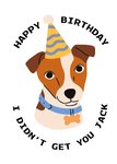 A playful and cheeky birthday card featuring an illustrated Jack Russell dog wearing a striped party hat and a blue collar with a bone tag.