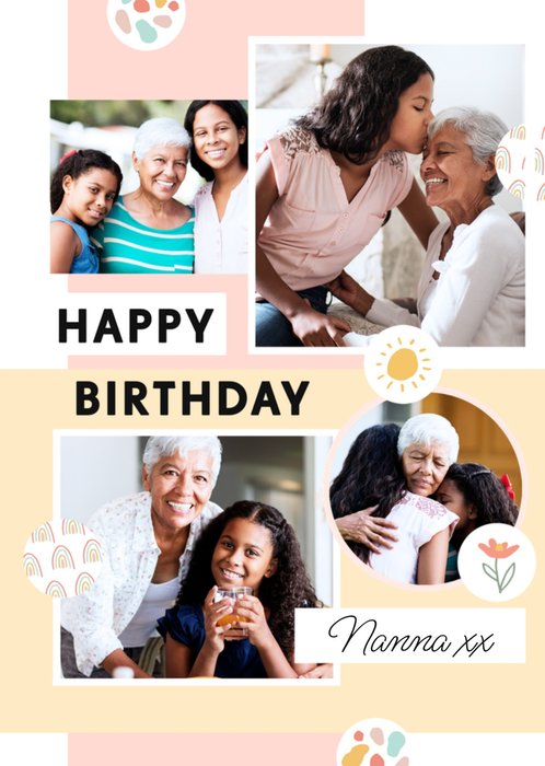 Front of card: A sweet and adoring Photo Upload Birthday Card for a grandma featuring a photo collage with hand-painted geometric shapes in the background. There are four photo upload areas.