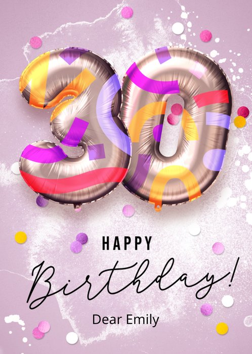 Featuring large pink foil number balloons with colourful abstract shapes, an editable message and scattered confetti dots on a lilac background.