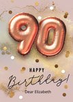 Featuring large rose gold foil number balloons and an editable message surrounded by confetti dots and gold foil details on a pale pink background.