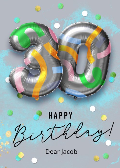 Featuring large silver foil number balloons with colourful abstract shapes, an editable message and scattered confetti dots on a silver gray background.