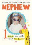 Featuring a cheerful message in a mix of vibrant colours and playful fonts. Below the text, there is a happy giraffe wearing a party hat at the bottom left of the design. The card is adorned with star shapes and dots scattered around as decorative elements, all set against a light beige background, adding a charming touch to the overall design. The central part of the card contains a photo upload area inside an oval frame with scalloped edges.