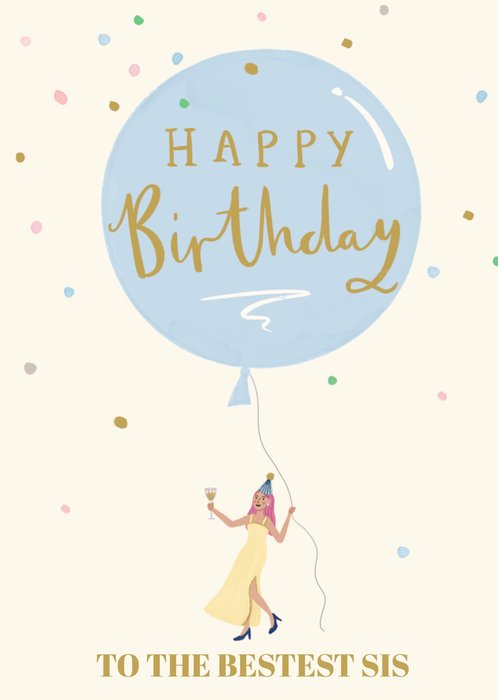Featuring a large blue balloon with gold lettering, surrounded by scattered confetti dots. Below the balloon is an illustration of a woman in a party hat holding the balloon string in one hand and a drink in the other. The design sits on a warm cream background.