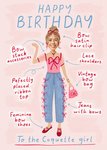 This feminine birthday card features a hand-drawn coquette-inspired outfit with playful annotations highlighting bows, lace, and vintage details. A soft pink background adds a whimsical touch. The circular photo cutout personalises the character’s face, while the text celebrates the recipient’s elegant style.