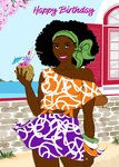 Featuring an illustrated woman with natural afro hair holding a pineapple cocktail beside a shuttered seaside window, on a light blue sky and sea background.