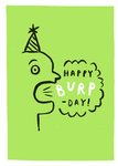Featuring a funny illustration of a burping face next to a brush-style message, on a green speckled background with a white edge.