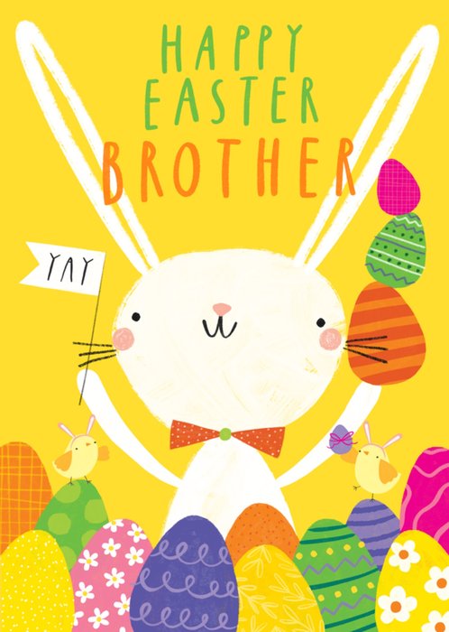 A cute, illustrative design featuring a white bunny with long ears, a red bow tie, holding a 'Yay' flag, surrounded by colourful patterned Easter eggs and two yellow chicks on a bright yellow background.