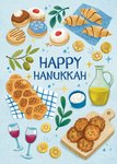 Front of card: A colourful design featuring a central hand drawn message surrounded by illustrations of food set out for a meal, all on a blue textured background.