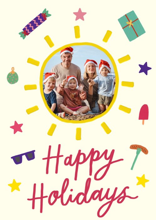 Featuring a photo frame in the shape of the sun surrounded by festive illustrations on an off white background.