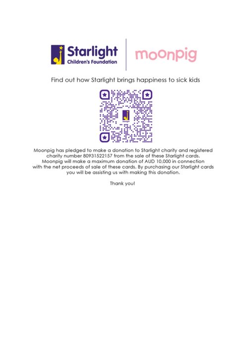 For over 30 years, Starlight Children's Foundation has worked alongside health professionals to bring fun, joy and laughter to seriously ill children and families across Australia - so that 'sick kids' can simply be 'kids'. For each card sold, $4 will be donated to Starlight Children’s Foundation and their work across Australia up to $10,000 AUD. Charity Number: 80931522157.