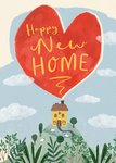 A warm, hand-painted scene showing a yellow house perched on a green hilltop beneath a large red heart-shape, containing a hand drawn message. Behind the house is a blue sky filled with soft clouds.
