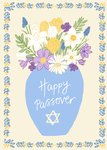 Front of card: A cheerful design featuring a vase of flowers with a hand-written Passover message and a Star of David, surrounded by a pretty floral border. The design is finished with a warm cream background.