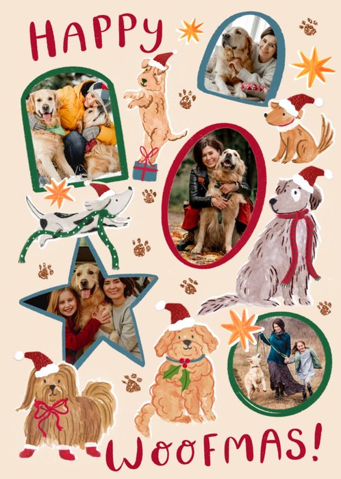 Featuring 5 photo upload frames surrounded by playful dog illustrations wearing santa hats, all on a cream coloured background with glitter paw prints, stars & bold red lettering above & below.