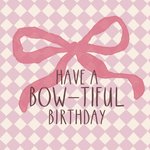 A modern design featuring a large pink ribbon bow above bold hand-drawn lettering, on a pink and cream diamond check pattern background.