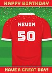 Featuring a bright red football shirt set against a green pitch background with confetti falling from above. The shirt displays editable name and number text fields styled in bold white sports lettering, with “Happy Birthday” in gold across the top and “Have A Great Day!” along the bottom border. This sporty design is perfect for football fans celebrating a birthday.