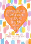 Front of card: Valentine's Day Card Heart shape with text on a colourful pattern background. Text reads: "No matter how much we say we love you, we will always love you more than that! Happy Valentine's Day from the kids". 'From the kids' can be personalised!
